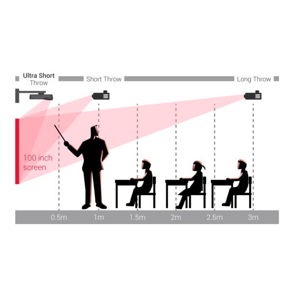 A short-throw lens allows for large images to be projected from a short distance. This design eliminates issues such as blinding lights in front of the projector, distracting shadows on the projected image, and glaring hotspots on the screen. Since the projector's light source is positioned closer to the surface being projected onto, distractions are minimized.